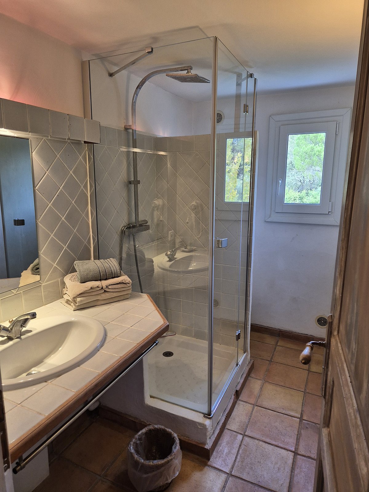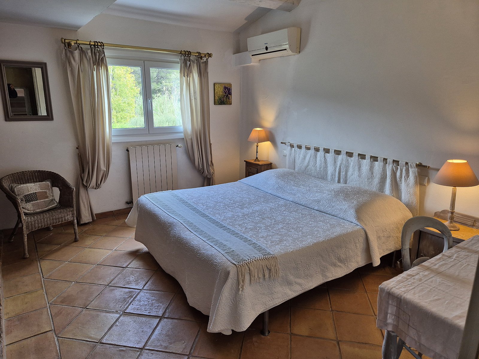 Belle chambre climatisée de 18 m2 orientée nord-est et offrant une belle vue sur la campagne et les bois environnants, ensoleillée dès le matin. Décoration provençale où la terre cuite et l’ocre vert pâle ajoute à la quiétude.